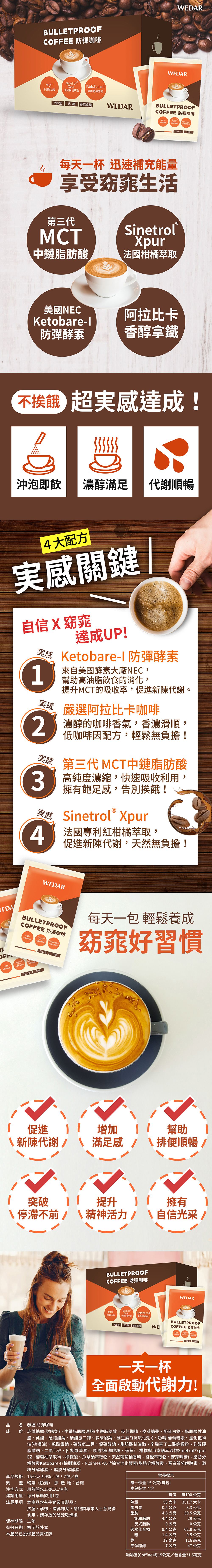 商品訊息簡述: 嚴選阿拉比卡咖啡,高純度濃縮第三代MCT,添加美國NEC防彈酵素,提升吸收率、促進新陳代謝。